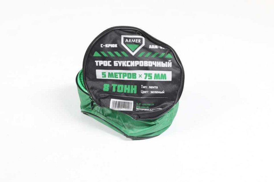 Трос буксировочный 8т. лента 75мм. 5м. С крюк, зеленый <Armer>