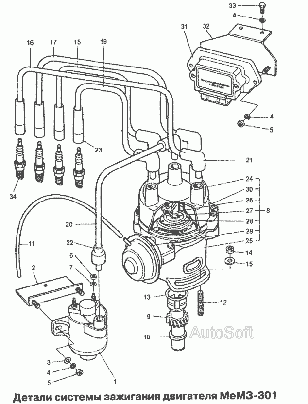 Деталі системи запалювання двигуна, свічки запалювання МеМЗ-301 » Електроустаткування з двигуном FAM I