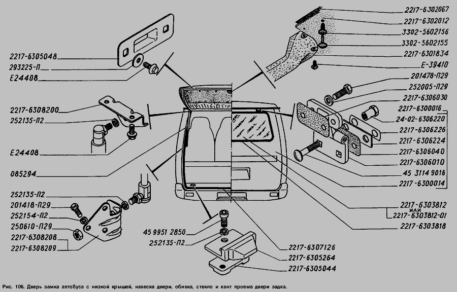 Двері задка автобуса з низьким дахом, навішування дверей, оббивка, скло та кант отвору дверей задка » Кузов